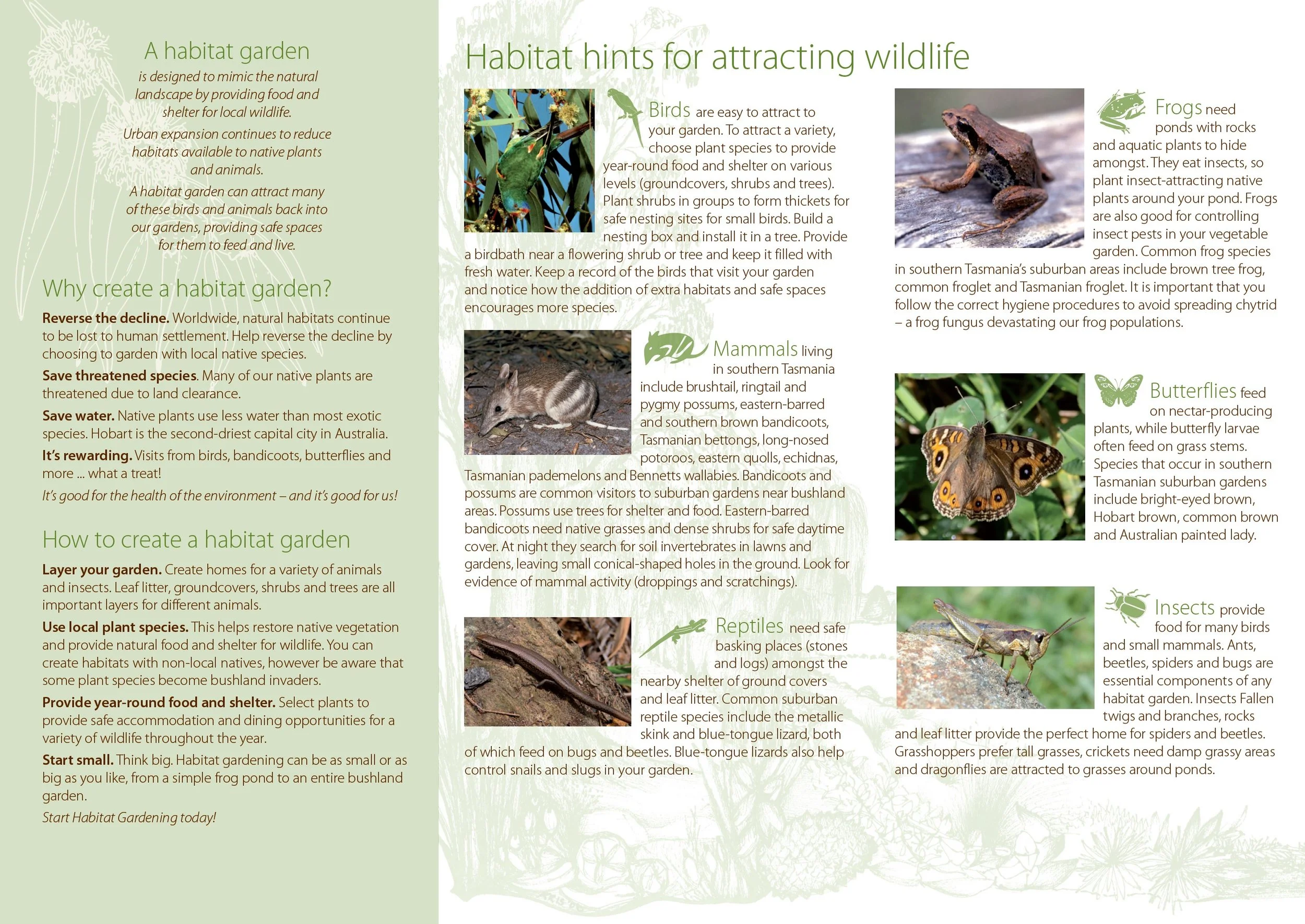 A habitat garden is designed to mimic the natural landscape by providing food and shelter for local wildlife. Urban expansion continues to reduce habitats available to native plants and animals.
